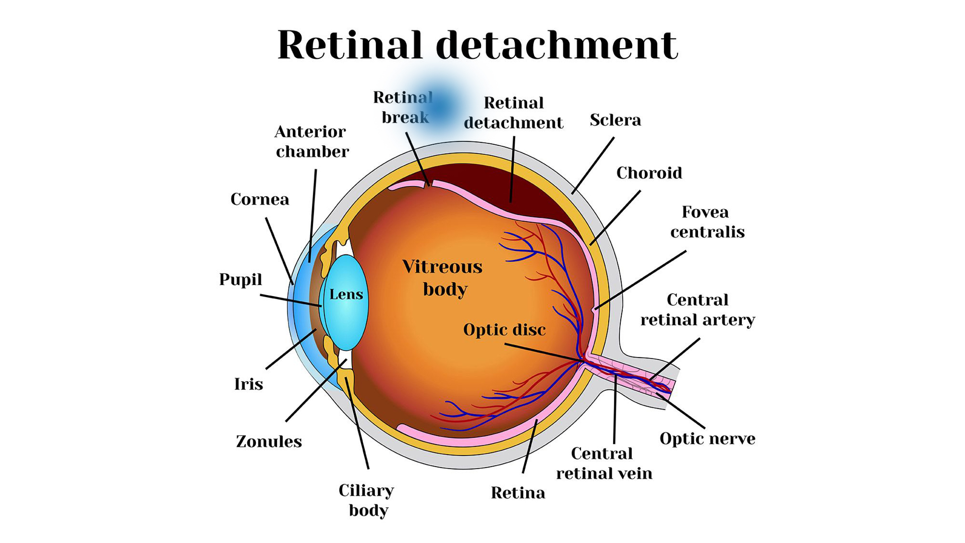 If you have a rhegmatogenous retinal detachment, you have a tear or hole in your retina. This allows fluid from within your eye to slip through the opening and get behind your retina. The fluid separates the retina from the retinal pigment epithelium, which is the membrane that provides your retina with nourishment and oxygen, causing the retina to detach. This is the most common type of retinal detachment.